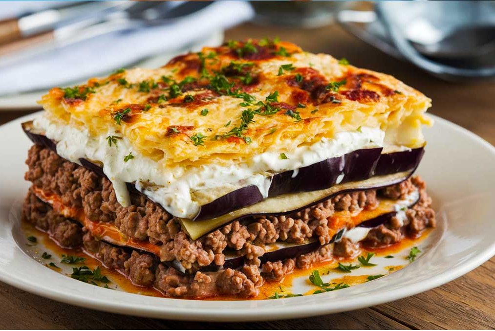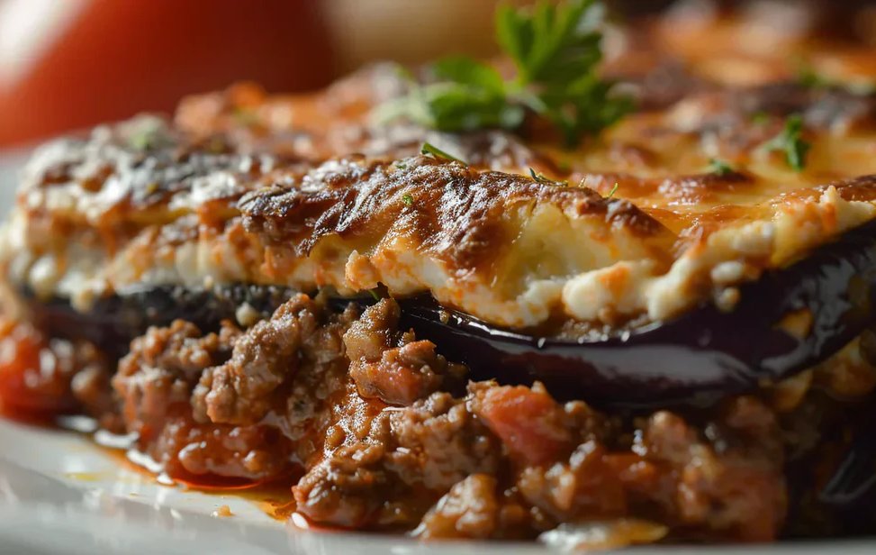Layered eggplant and vegetables baked in rich Mediterranean spiced sauce