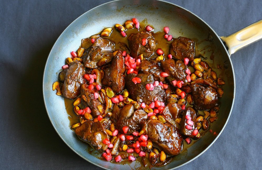 Savory chicken livers paired with sweet-tangy pomegranate molasses in bread