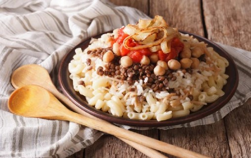 Lentils, rice and pasta layered with mild sauce for comfort